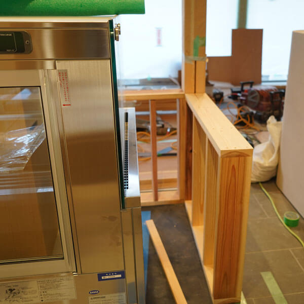 ピカピカの冷蔵ショーケースも入荷し、その周りを囲む大工工事が始まりました。