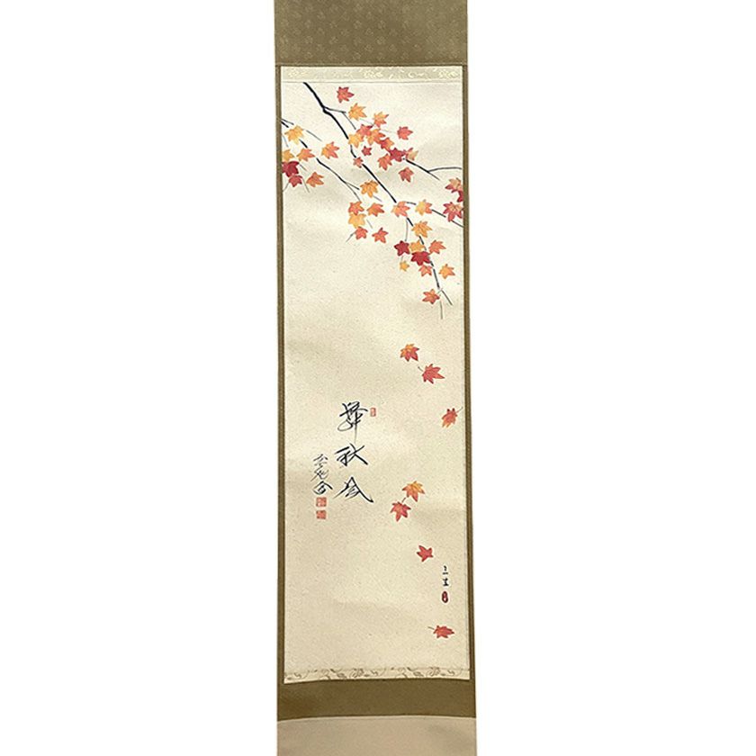 茶道において、お客様が茶室へ入り一番初めに拝見するものが茶席の床の間に掛けられた軸装された「掛物」です。 茶事・茶会において、掛物は亭主の意図するところや、季節感を端的に表現する第一のもので大切なお道具です。 掛物は紙や裂で表装して掛けるように仕立てられたものをいいますが、 大きくは、「書蹟」と「絵画」、そして両者が一体となった「画賛」に分けられます。 数寄者の間では「開炉一行、春懐紙、夏は短冊、秋は文」とも言われています。 掛物はその作者が最も重要とされていますが、四季それぞれに合わせた季節感も大切です。