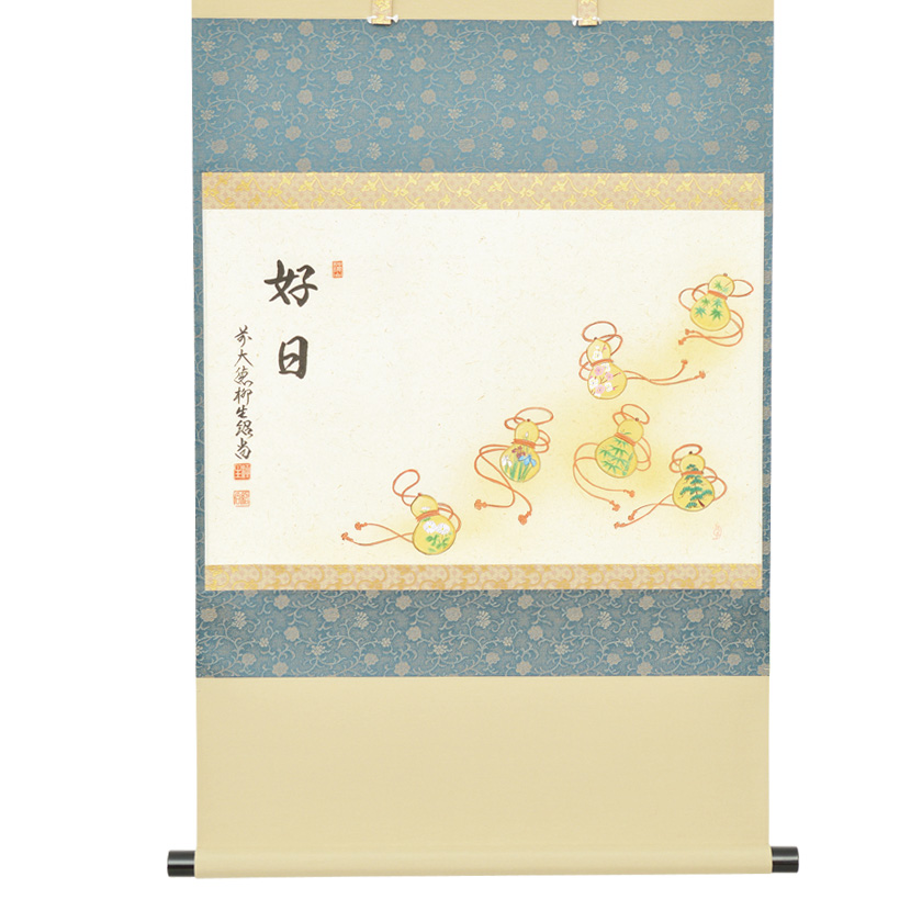 茶道具 掛軸(かけじく) 軸横物画賛 六瓢の図 「好日」 橋本紹尚師 奈良柳生芳徳禅寺・上村久志画