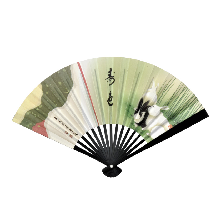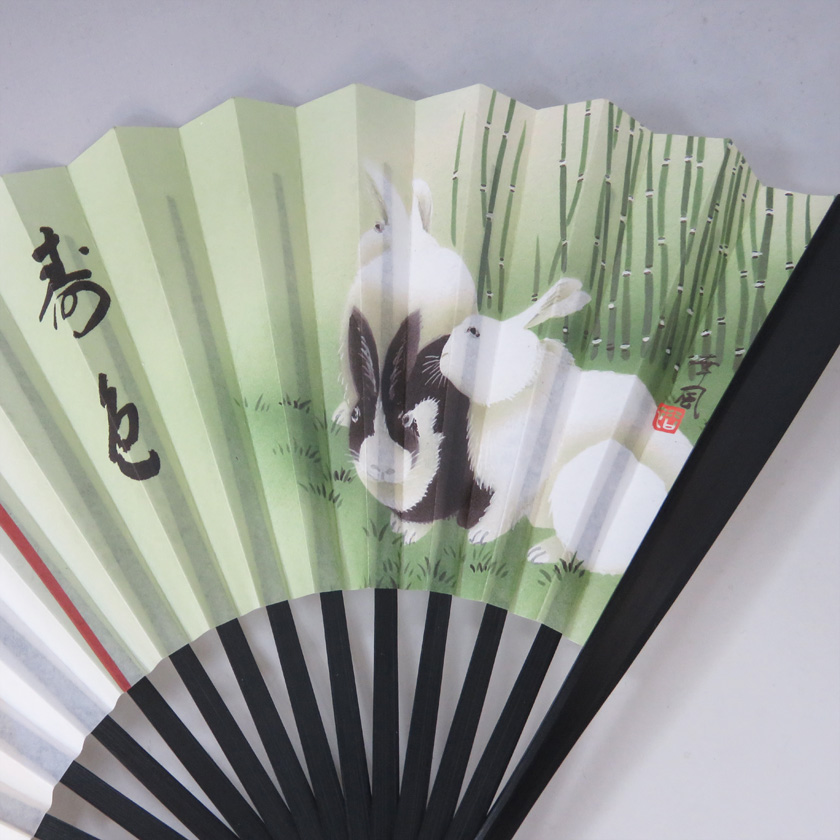 茶道具 扇子(せんす) 扇子 6寸 黒塗 木賊(とくさ)に三つ兎 積應師墨跡写「寿色」 (裏面:千家十職) 干支 曽根幸風画
