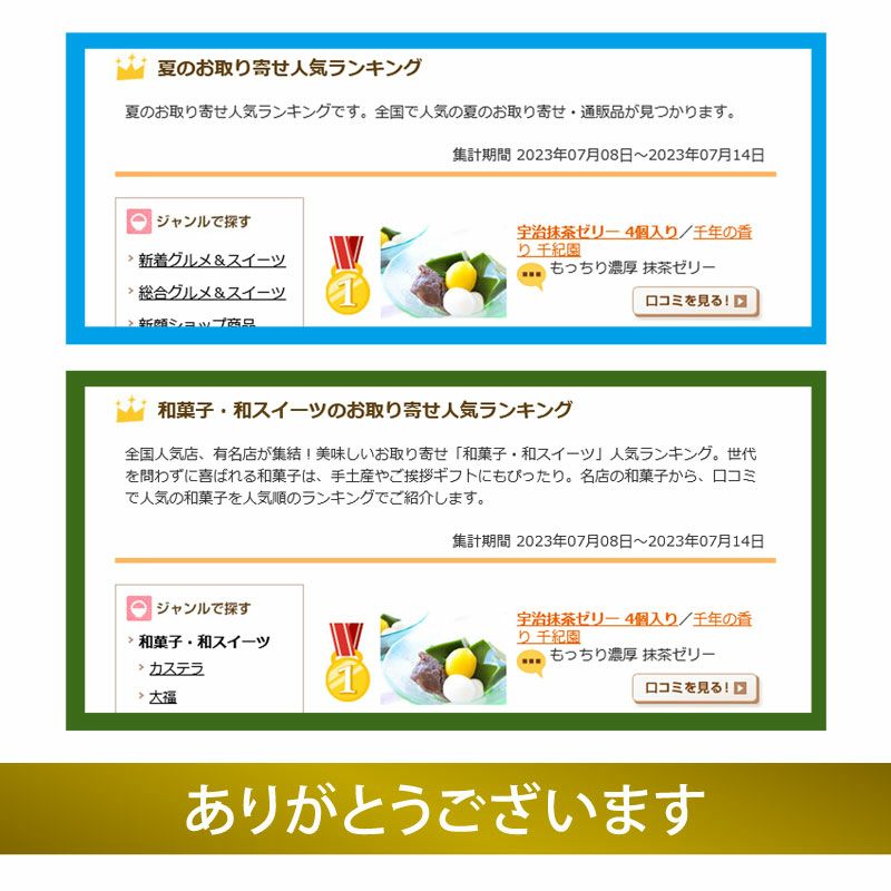 他の画像を見る 老舗茶舗のひやひやスイーツセット 抹茶ゼリー2個 水ようかん2個 梅ゼリー2個 黒わらび餅2個 在庫切れ お気に入りに登録する のし・掛紙 簡易包装 クール便 価格 ¥ 3,950 税込 (0)
