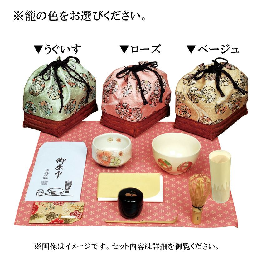 他の画像を見る 茶道具 源氏籠セット内容:利休茶碗・小茶碗・樹脂製寸八棗・茶筌・竹茶筌筒・茶巾・折茶杓・懐紙・菓子受け・風呂敷● ベージュ・ローズ・うぐいすから色をお選びください。 詳細を見る お気に入りに登録する (0) 価格 ¥ 27,742 税込